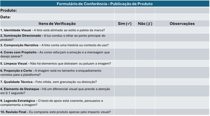 No universo digital, improvisar pode custar caro. Uma foto mal pensada pode enterrar um produto excelente antes mesmo que ele tenha chance de conquistar alguém. Seguir um plano de conferência não é preciosismo: é o que separa fotos amadoras de imagens irresistíveis, capazes de vender antes mesmo do cliente ler a descrição.
